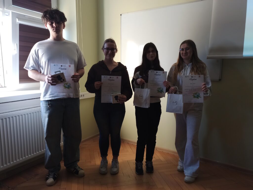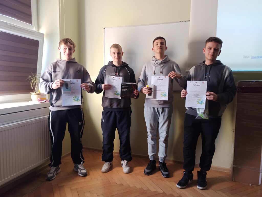 Nagrody otrzymali: I miejsce – Kamil Rąpała, klasa 2 TA II miejsce – Bartosz Gawron, klasa 2 TB III miejsce – Albert Sadko, klasa 2 TB Wyróżnienia – Alicja Witkowska i Kacper Gajewski, klasa 2 TB
