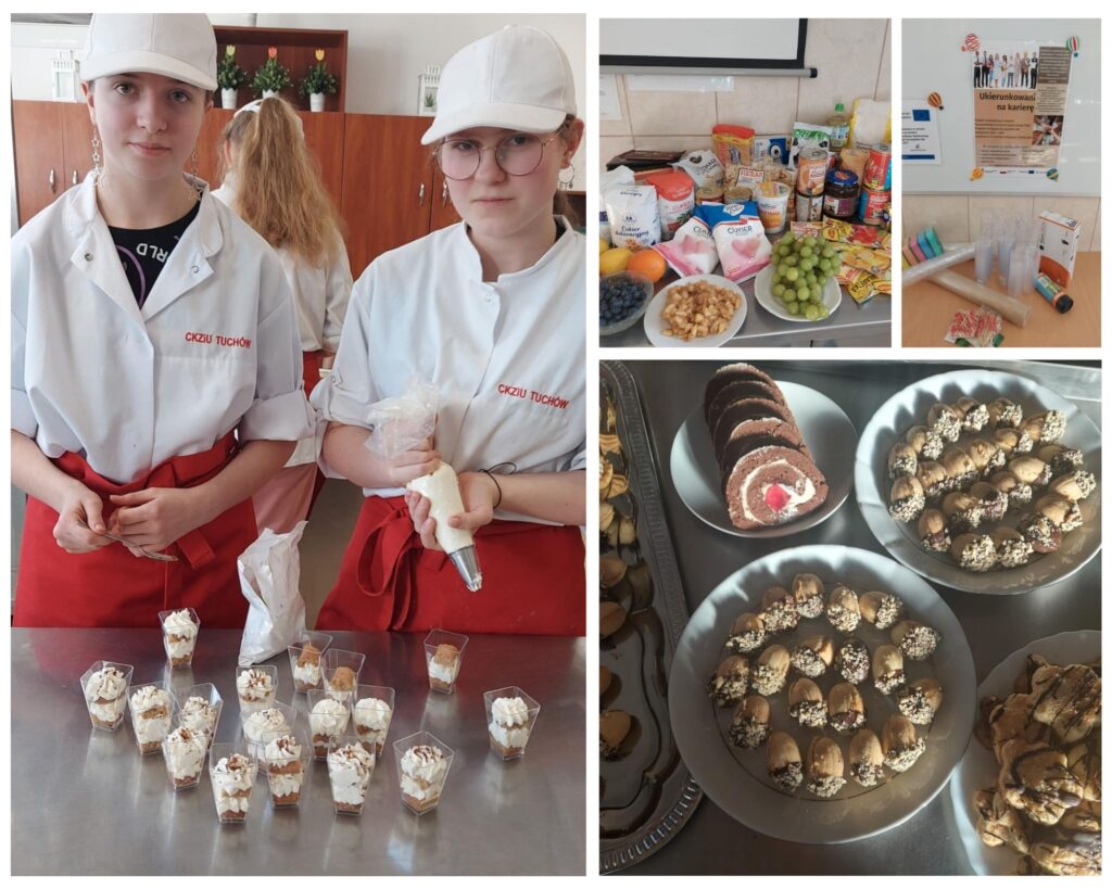 20 marca 2025 r. w ramach projektu „Ukierunkowani na karierę” odbyły się w naszej szkole  kolejne zajęcia związane z wyborem kierunku kształcenia i zawodu tym razem promujące zawód cukiernika . W ramach projektu zakupione zostały produkty spożywcze z których uczestnicy wykonali wybrane wyroby cukiernicze, dzięki czemu poznali specyfikę pracy  cukiernika oraz nabyli elementarne umiejętności niezbędne w tym zawodzie.