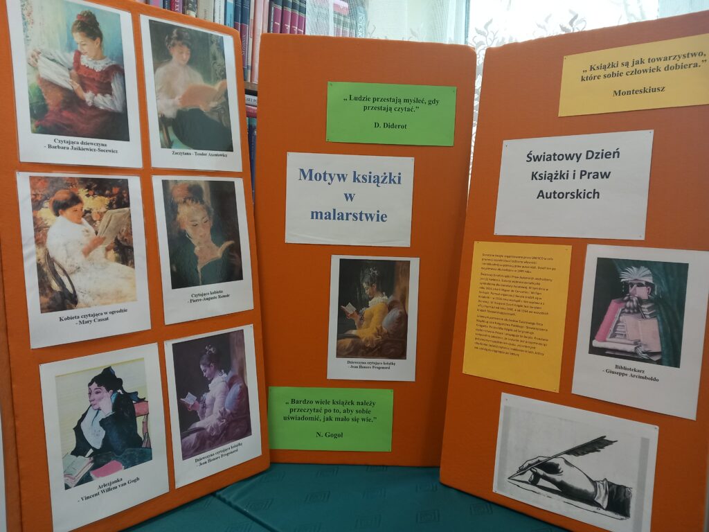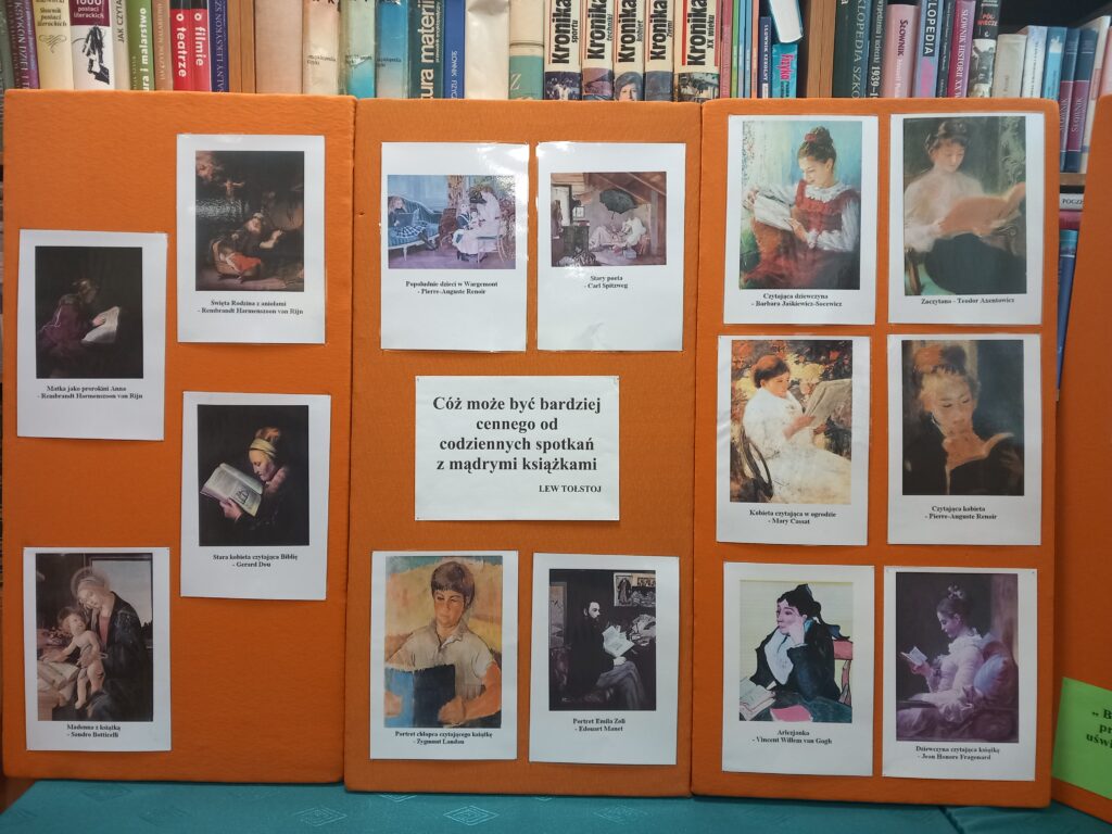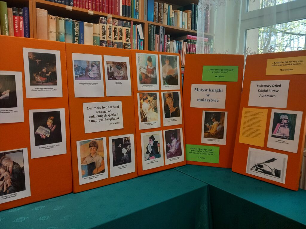 Dzień Książki przypada 23 kwietnia i celebrowany jest na całym globie. Ustanowiony został w 1995 roku przez UNESCO jako doroczne święto mające na celu promocję czytelnictwa, edytorstwa i ochronę własności intelektualnej. W Polsce święto obchodzone jest od 2007 roku. Jego celem jest obudzenie radości czytania i nakłonienie tych, którzy nie czytają do sięgnięcia po lekturę. Z okazji Światowego Dnia Książki i Praw Autorskich w bibliotece szkolnej CKZiU w Tuchowie od 23.04.2025 do 10.05.2025 prezentujemy reprodukcje słynnych dzieł malarstwa światowego ukazujące motyw książki i czytania. Dla wielu znanych malarzy książka była cennym przedmiotem zainteresowania. Nic więc dziwnego, że w każdej epoce zarówno książki jak i czytający ludzie, często pojawiają się jako motyw malarski. Śledząc motyw książki w malarstwie, przyglądając się scenom zaczytania i fascynacji lekturą, możemy poznać historię książki i czytelnictwa oraz wzbogacić posiadaną wiedzę na temat kultury czytelniczej, a co najważniejsze dostrzec emocje towarzyszące zatopionym w lekturze osobom. Zapraszam do obejrzenia wystawy. Życzę pozytywnych wrażeń i refleksyjnego spojrzenia na książkę i proces czytania. Jednocześnie zachęcam do poszukiwania ciekawych obrazów, których przedmiotem jest książka i życzę fascynujących odkryć. Barbara Mazurkiewicz