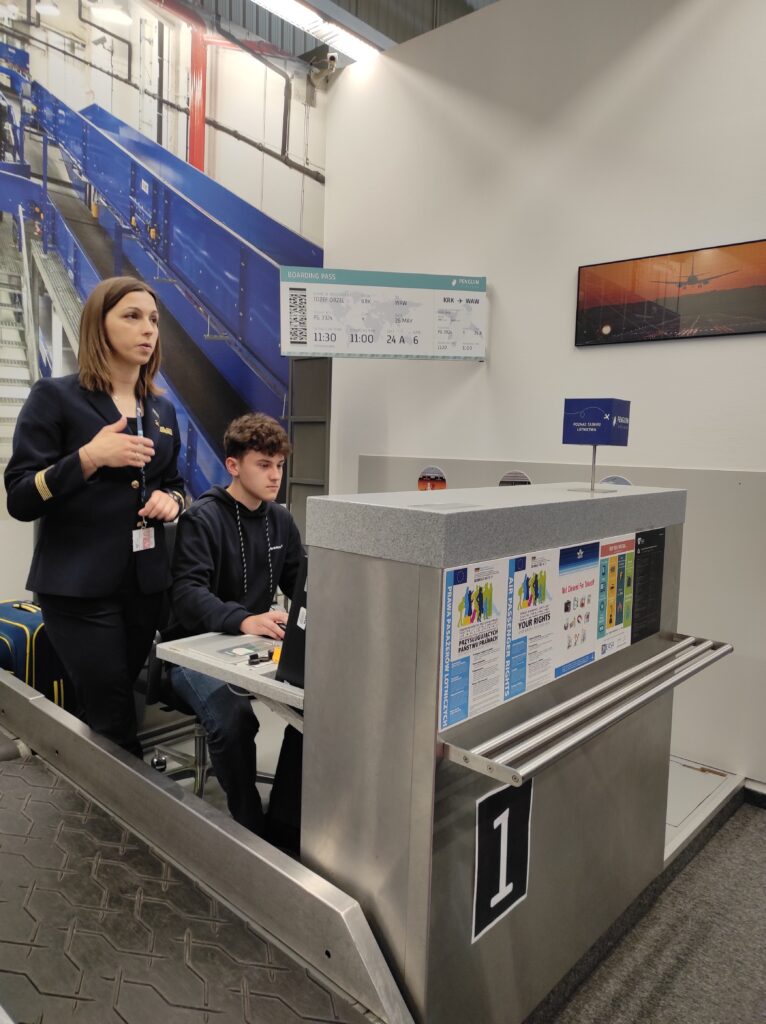 Pierwszym punktem programu była gra terenowa „Poznaj lotnisko”. Uczniowie, podzieleni na zespoły, poruszali się po ogólnodostępnej części lotniska, rozwiązując zagadki za pomocą aplikacji CEL KRK i ukrytych kodów QR. Rywalizacja wymagała współpracy, sprytu i znajomości nowych technologii. Gra odbywała się częściowo na świeżym powietrzu, co dodało jej dynamiki i pozwoliło lepiej poznać przestrzeń portu lotniczego.