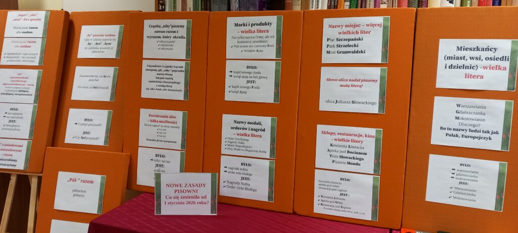 Od 1 stycznia 2026 roku weszły w życie znaczące zmiany w polskiej ortografii i interpunkcji. Wprowadzone zostały przez Radę Języka Polskiego. Mają na celu zmniejszenie liczby błędów językowych poprzez uproszczenie zasad ortograficznych i wyeliminowanie wyjątków. Obowiązek stosowania wyłącznie nowych zasad wejdzie od 2031 roku. Dyrektor Centralnej Komisji Egzaminacyjnej wydał komunikat, w którym informuje, że w latach 2026-2030 na egzaminie maturalnym akceptowana będzie zarówno stara, jak i nowa pisownia. W ostatnim tygodniu lutego w bibliotece prezentowano młodzieży najważniejsze przykłady zmian. Uczniowie mieli okazję poznać nowe reguły pisowni i sprawdzić swoje umiejętności w tym zakresie. Przygotowano zabawy słowem: grę „scriba” łączącą elementy gier losowych, strategicznych i logicznych, wymagającą koncentracji, logicznego myślenia i wyobraźni, ćwiczono łamańce językowe. Indywidualnie i grupowo młodzież rozwiązywała łamigłówki, quizy, krzyżówki i testy wzbogacając w ten sposób słownictwo i poprawność językową.