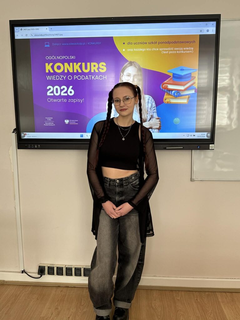 Pierwszy etap konkursu odbył się 6 marca 2026 r. w formie testu online. Wzięli w nim udział uczniowie klas 4 i 5 naszego technikum ekonomicznego. Wysoki poziom wiedzy oraz zaangażowanie uczestników zaowocowały sukcesem naszej uczennicy, która znalazła się w gronie finalistów.